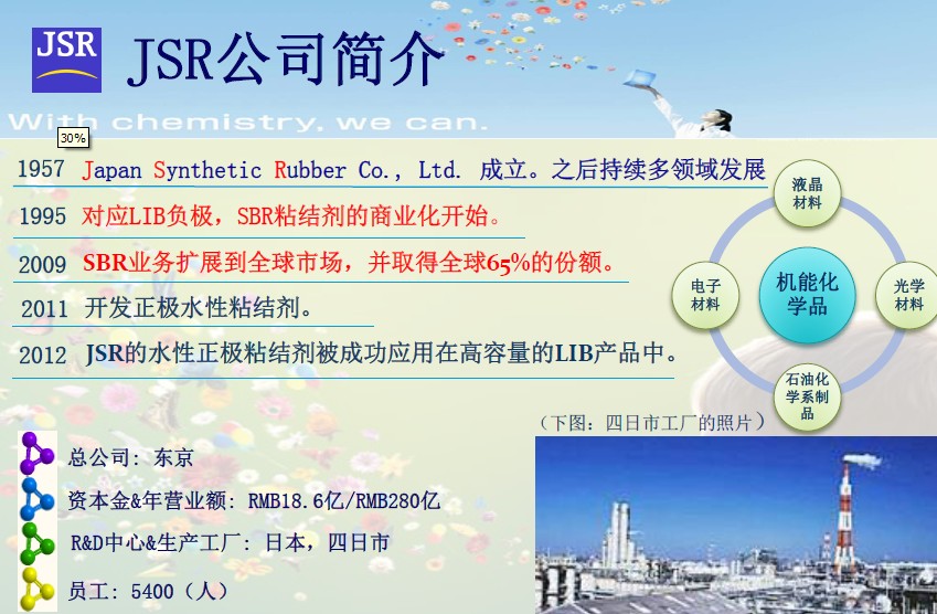 JSR株式會社是一家致力于開發和生產石化和精細化工產品的全球性化工企業,JSR提供用于電池電極的水性粘結劑并擁有市場的領導地位。JSR的SBR水性負極粘結劑目前被全球多家領先電池企業使用并被證明是一種高性能的粘結劑。同時JSR最新開發了用于正極的水性粘結劑,該產品不光可以降低成本,同時提供電池性能并且符合目前環保的潮流。