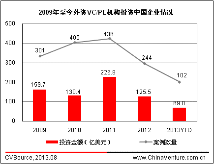 2012年以來,中國PE市場明顯降溫,在此背景下,外資VC/PE機構在中國投資數量和規模雙雙下滑。根據ChinaVenture投中集團旗下CVSource 統計顯示,2012年共披露244起外資VC/PE機構投資中國企業案例,投資總額125.5億美元,相比2011年全年(436起案例、投資總額226.8億美元)分別下降44.0%和44.6%。2013年至今,共披露102起外資VC/PE機構投資中國企業案例,投資總額69.0億美元,呈現較明顯下降趨勢(見圖3)。