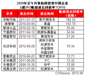 表2 2009年至今外資機構投資中國企業A股IPO賬面退出回報TOP10