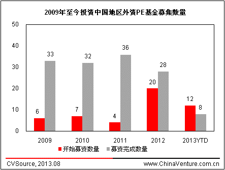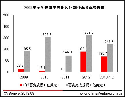 根據ChinaVenture投中集團旗下金融數據產品CVSource 統計顯示,2009-2011年投資中國地區的外資PE基金成立數量和目標規模整體處于較低水平,2012年呈現爆發式增長,全年共披露20支外資PE基金成立并開始募集,總計目標規模182.1億美元。2013年至今,共披露12支外資PE基金成立并開始募集,總計目標規模136.7億美元,新基金成立仍較為活躍。