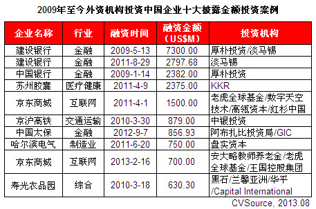 表1 2009年至今外資機構投資中國企業十大披露金額投資案例