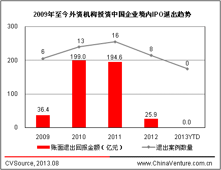 根據ChinaVenture投中集團旗下數據產品CVSource統計顯示,2009-2011年,外資機構投資中國企業A股IPO退出案例數量逐年上升,2011年達到了16起,創下歷年新高。2010年和2011年累計賬面退出金額分別為199.0億元、194.6億元。其中,2011年的華銳風電,2010年的海普瑞與九州通(兩家加總)為外資機構帶來的賬面回報均超過100億元,在當年統計數據中占據重要地位。2012年以來,在宏觀經濟及資本市場缺乏利好因素的形勢下,PE市場持續低迷,退出渠道有所收窄。2012年,外資機構投資中國企業A股IPO退出案例僅有8起,累計實現賬面退出金額25.9億元,退出案例數量和退出金額均出現大幅下滑。2013年,A股IPO持續冰封,沒有企業實現IPO退出(見圖4)。