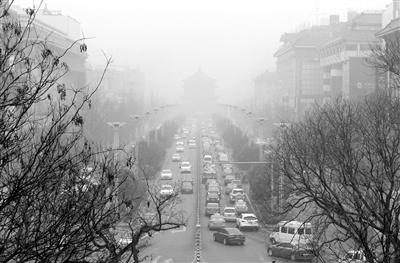 圖為西安鐘樓在霧霾中若隱若現(xiàn)。