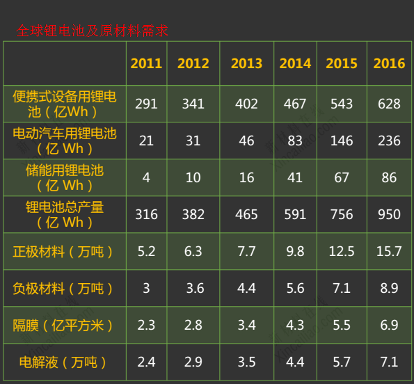 根據慧博資訊最新研報,需求沖擊導致2015年全球供需平衡表出現了9100噸碳酸鋰短缺。按中國全年30萬輛、歐洲和美國市場最新銷量重估全年需求,全球新能源汽車對碳酸鋰需求已爆發至3.86萬噸,較市場普遍預期暴增1.13萬噸。2015年全球碳酸鋰需求預計為21.18萬噸,同比增速19.64%。除新能源汽車外,工業需求12.3萬噸,3C數碼消費品需求5 萬噸,儲能需求1700噸。由于生產工藝、成本偏高等因素,今年多處產能未能充分釋放,預計2015年全球鹽湖/礦山提鋰的總產量僅20.28萬噸。 2016年-2018年全球碳酸鋰需求預計分別為24.42萬噸、28.89萬噸和34.10萬噸,對應增速18.3%、18.0%和19.9%。增長的動力主要來自新能源汽車,若中國新能源汽車產量增速維持100%增長,即使考慮動力電池能量密度上升,2016-2018年全球新能源汽車碳酸鋰需求還將上升至6.41萬噸、9.76萬噸和13.67萬噸。