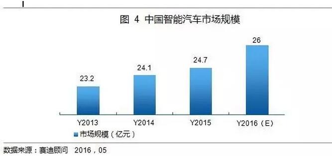 在國內(nèi)市場上,2015年國內(nèi)智能汽車市場規(guī)模約25億元。相比全球市場,國內(nèi)的輔助駕駛系統(tǒng)市場滲透率總體水平較低。盡管合資品牌的輔助駕駛系統(tǒng)市場滲透率相對自主品牌高,尤其是中高端轎車及SUV車型中,但目前國內(nèi)自動駕駛技術(shù)尚處于初級駕駛輔助階段,具備一項(xiàng)或多項(xiàng)局部自動駕駛功能。實(shí)現(xiàn)L1階段的輔助駕駛功能需要500美元左右的投入,賽迪顧問研究認(rèn)為,2015年國內(nèi)輔助駕駛系統(tǒng)帶來的市場規(guī)模約24.7億元,預(yù)計2016年國內(nèi)汽車銷量突破2580萬輛,輔助駕駛系統(tǒng)市場規(guī)模有望達(dá)到26億元,如圖4所示。