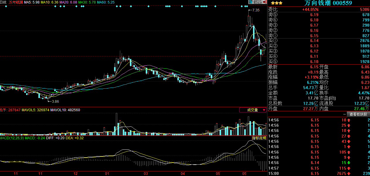 中國電池網-中國電池雜志6月18日(梁小婧北京報道) 美國電動車公司菲斯科的并購上周以來成為市場傳言和受媒體關注度最多的公司,而中國萬向集團旗下上市公司萬向錢潮(000559)近期受二級市場資金面關照,股價企穩,今日高開高走,截止到14:40分,盤中收在6.20元,上漲3.86%。