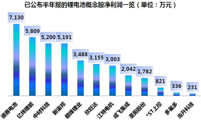 今年炒的如火如荼的美國新能源汽車特斯拉開始接受在華預定,鋰電池概念股周五早盤繼續活躍。該板塊年初至今累計上漲近50%,是表現較好的概念板塊之一。多只個股成功翻倍,包括億緯鋰能、德賽電池、中材科技、欣旺達、金瑞科技。截至8月22日晚間,該板塊有12只個股公布半年報,其中7公司中報凈利同比增長,多氟多等5家公司中報凈利有所下滑,但12家公司都實現不成程度盈利,詳情如下圖所示。
