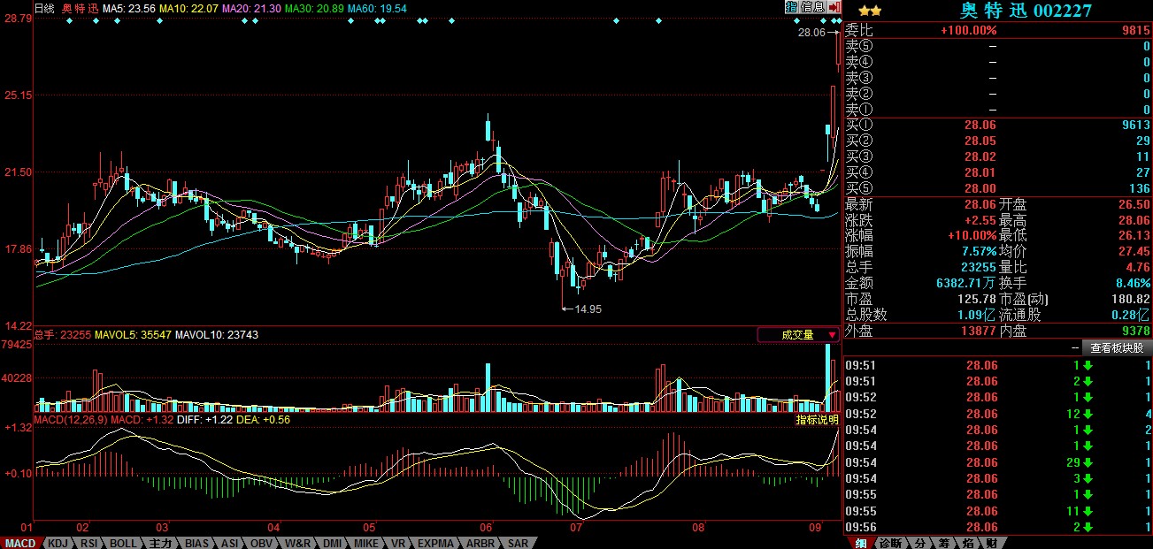 受上周末新能源汽車補(bǔ)貼預(yù)期利好刺激,9月9日早盤,新能源汽車、鋰電池產(chǎn)業(yè)鏈概念上市公司出現(xiàn)整體上漲行情,其中充電樁概念股奧特迅(002227),開盤不久就被巨量買盤封至漲停,截止本網(wǎng)發(fā)稿時(shí),該股上漲10%,價(jià)格為28.06元。同時(shí),比亞迪、杉杉股份、西部資源漲幅居前。