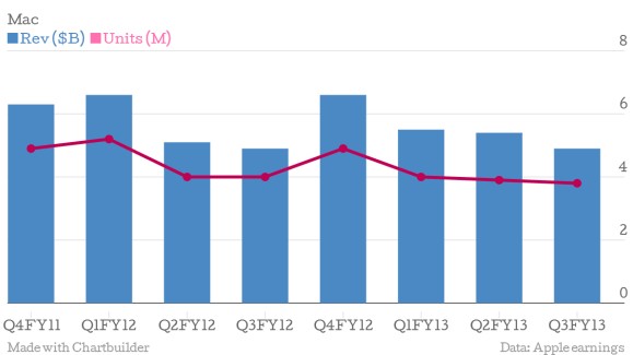 個人電腦產業的衰落導致人們產生一種錯覺,那就是在計算機銷售方面蘋果與其他企業相比似乎是個例外,但統計數據表明事實并非如此。實際上,Mac銷量與去年同期相比已下滑近10%,并且最近一個季度的銷量同兩年前銷售最佳的那個季度相比下滑幅度高達27%。造成這種現狀的原因之一便是蘋果自己的平板電腦對個人電腦市場的沖擊,但另一部分原因則是Mac設計更新沒有跟上,在某些關鍵細分市場沒有競爭力。從另外一個角度來看,即便是在兩年前,Mac部門在蘋果公司業務中還占據22%的份額,而在最近一個季度,僅占14%,還曾在上一假日購物季跌破10%。實際上,根據統計數據,個人電腦市場年銷量仍有3億臺,假如蘋果公司能夠找到方法抓住這一機遇,顯然還存在成長機會。
