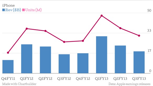 蘋果公司在營收方面相當依賴iPhone。據報道,iPhone約占蘋果公司業務一半的份額,因此iPhone銷售增長必將強有力帶動該公司營收增長。根據此前發布的財報數據,蘋果公司2013財年每一財季的iPhone銷售都好于2012財年相應財季,但這家企業現在面臨季節性因素和增長放緩的挑戰。