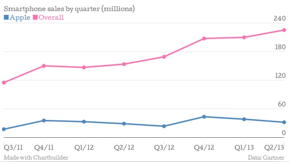 總的來說,智能手機市場增長驚人,在過去兩年里幾乎翻一番。雖然iPhone仍然流行,但整個市場季度出貨量從1.15億部提高到2.25億部,幾乎翻了一番。不像蘋果的起止圖受產品年度周期影響出現下降,智能手機整體市場并不存在周期性下滑。最終的結果是,蘋果的市場份額在20%上下波動,并曾在某一季度的基礎上下降到低至百分之十幾。