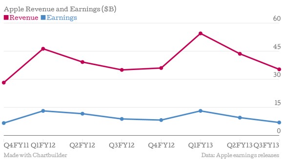 蘋果公司將在兩周內發布第四財季收益報告。因iPhone新品上市后表現強勁,蘋果預計該季營收或將觸及該公司三個月前公布的營收指引上限。然而,即便是超過370億美元的預期目標,也不過與去年同期持平而已。作為曾極有抱負的一家企業,蘋果在2010到2011年間,其營收增長高達65%,去年也達到45%。目前,該公司剛結束兩位數的財年總增長,跌至個位數。盡管蘋果仍然賺錢,但其盈利將低于去年。以下5個圖表從蘋果公司主要業務方面分析為何這家企業會每況愈下。