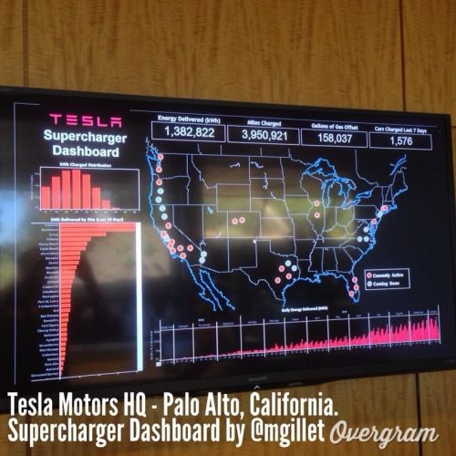 特斯拉汽車公司總部設有一塊超級充電站顯示屏,通過網絡實時獲取并反饋美國全境Model S電動汽車的充電狀況。 顯示屏中標示出了美國所有正在和等候中的超級充電站位置,以及許多其他相關