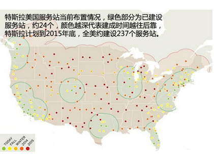 目前全美特斯拉快充服務站大概有24個已經正式投入經營,主要覆蓋美國東北部以及西南部業務比較成熟地區。特斯拉計劃在2015年底服務站將全面覆蓋美國以及加拿大靠近美國的邊緣地帶。