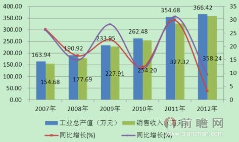 圖表1:2007-2012年我國電容器及其配套設備制造行業工業總產值及銷售收入變化情況(單位:億元,%)