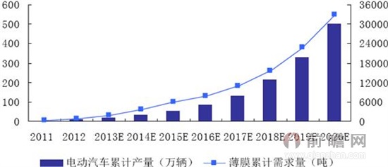 圖表2:2011-2020年我國新能源汽車對薄膜需求量預測(單位:萬輛,噸)