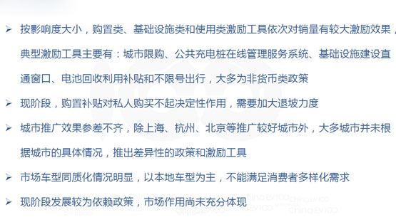 研究發現,目前我國新能源乘用車推廣主要依賴政策和激勵工具,各城市激勵工具總量和種類對新能源乘用車銷量有顯著影響;激勵工具中城市限購對新能源乘用車銷量影響最大,相比而言,現階段購置補貼對新能源乘用車銷量影響沒有期望中那么大。