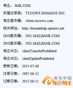 查詢易名whois系統,bak.com早在1997年6月12日就被注冊,其他相關主流后綴域名均已注冊。其中,bak.cn已建站,而域名bak.com.cn則被中國比克電池股份公司(BAK BATTERY)啟用建為官方網站。