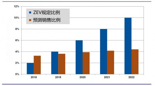 然而,達(dá)到上述強(qiáng)制執(zhí)行的銷售水平的可能性并不大。目前ZEV法案規(guī)定的內(nèi)容是在2008年制定的,以2009年-2017年的車型為對(duì)象,要求2018年款電動(dòng)車型的ZEV最低比例為2%,2022年升至10%,大約是2018年車型的5倍。由于一些車型每次能夠得到不止一個(gè)積分,實(shí)際產(chǎn)量可能比要求的比例要低。