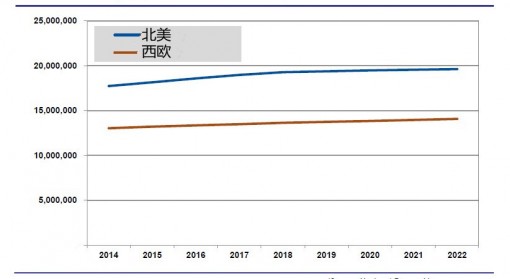 在北美和西歐等成熟汽車市場(chǎng),新車銷售已經(jīng)接近峰值。根據(jù)Navigant的電動(dòng)汽車市場(chǎng)預(yù)測(cè)報(bào)告數(shù)據(jù),2014年到2022年,所有輕型車輛的復(fù)合年均增長(zhǎng)率西歐地區(qū)每年僅為1%,北美地區(qū)每年僅為1.3%。