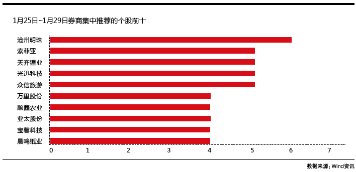 1月25日-29日券商集中推薦的股票前四名為:滄州明珠、索菲亞、天齊鋰業、光迅科技,這4家公司分屬上海A股、深圳A股。4家上市公司均屬行業龍頭,有3家已披露年報顯示業績大幅增長。滄州明珠通過定增助力新項目,有望增強公司盈利能力;天齊鋰業得益于行業利好,公司有望持續受益;索菲亞和光迅科技則通過投產新項目以及提高生產效率等方式增厚公司業績。