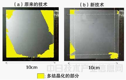 分別從利用原有技術(shù)及新技術(shù)培育的類單晶硅錠中切割出來的晶圓的截面照片。除了人工晶界的形成之外,均在同一工序及條件下制造。多晶化的部分用黃色表示。右圖中的白虛線表示人工形成的Σ5晶界的位置。借助Σ5晶界,將多晶化限制在不作為太陽能電池使用的硅錠外周部。