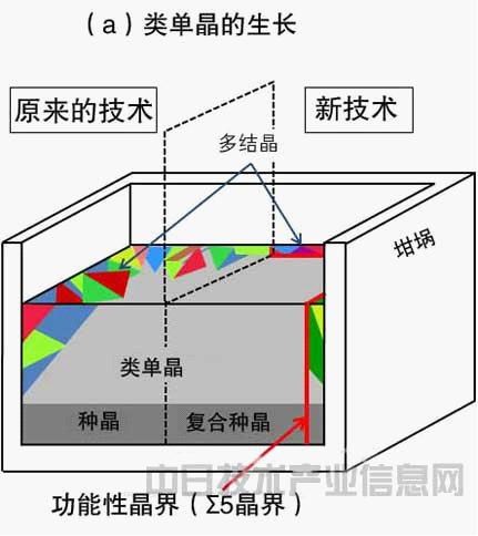 類單晶硅的生長模式圖。左為原有技術(shù),右為新技術(shù)。