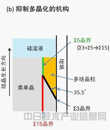 抑制多晶化的機理。坩堝近旁的擴大圖。Σ3晶界與Σ5晶界反應變成Σ15晶界,可由此使多晶區(qū)域停止向坩堝中央推進。