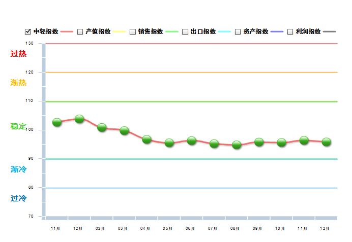 12月份中輕景氣指數(shù)為95.84,位于“穩(wěn)定”區(qū)域(參見圖1-1)。與11月份相比中輕景氣指數(shù)下降0.52。