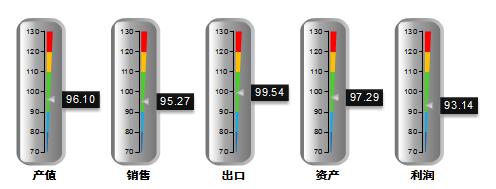 從分指標(biāo)運(yùn)行指數(shù)來看,2012年12月中輕產(chǎn)值景氣指數(shù)96.10(上月 95.35)、銷售景氣指數(shù)為95.27(上月96.12)、出口景氣指數(shù)99.54(上月102.00)、資產(chǎn)景氣指數(shù)97.29(上月97.77)、利潤景氣指數(shù)93.14(上月 93.13)。除產(chǎn)值景氣指數(shù)以外,其他分項(xiàng)指標(biāo)景氣指數(shù)均有所下降。