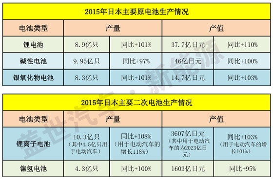 「蓋世汽車·新能源」獨(dú)家報(bào)道,2015年1-12月,日本電池(包括原電池和二次電池)總產(chǎn)量超過43億只,總產(chǎn)值逾8075億日元(約463億元人民幣),產(chǎn)量和產(chǎn)值與上年同期相比均實(shí)現(xiàn)101%的增長幅度。