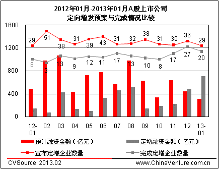 圖1 2012年01月-2013年01月A股上市公司定向增發預案與完成情況比較