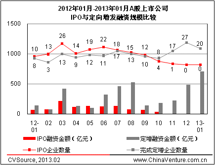 圖2 2012年01月-2013年01月A股上市公司IPO與定向增發融資規模比較