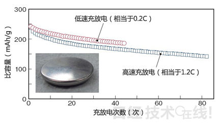 利用東京理科大學試制的紐扣型電池進行充放電的結果顯示,鈉離子充電電池在高速充放電中也具備優異的特性。(圖由《日經電子》根據東京理科大學的資料制作)
