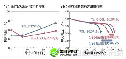 圖9:具備高容量維持率的固體電解質(zhì) 豐田確認(rèn),作為全固體電池的固體電解質(zhì),具備高耐水性的75Li2S·25P2S5在60℃的保存試驗(yàn)中,內(nèi)部抵抗難以上升(a)。試制充電電池測(cè)量容量變化時(shí)發(fā)現(xiàn),1個(gè)月后保持了86%的容量(b)。(圖由《日經(jīng)電子》根據(jù)豐田的資料制作) |