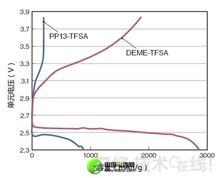 豐田通過(guò)在鋰空氣電池的電解液溶劑中采用乙醚類(lèi)離子液體DEME-TFSA,實(shí)現(xiàn)了與有機(jī)溶劑相當(dāng)?shù)娜萘俊#▓D由《日經(jīng)電子》根據(jù)豐田的資料制作)