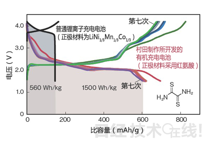 有機化合物與現行的材料相比可提高正極的比容量。村田制作所將紅氨酸定位為主要候補,已確認可將容量密度提高到650mAh/g左右。(圖由《日經電子》根據村田制作所的資料制作)