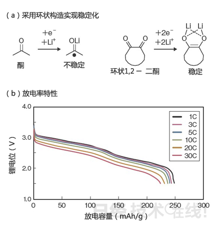 京都大學和松下開發出了正極材料采用將兩個酮連接形成環狀構造的環狀1,2-二酮的有機充電電池(a)。支持30C的高速充放電(b)。(圖由《日經電子》根據京都大學的資料制作)