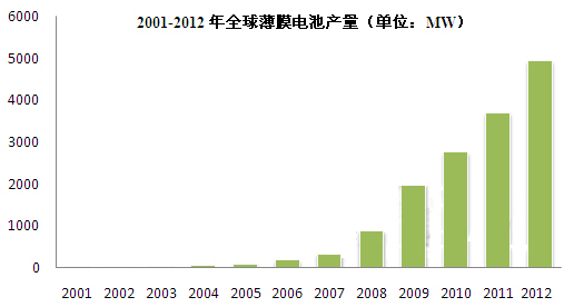 全球薄膜電池行業興起始于2005年。據OFweek行業研究中心出版的《2013-2015年全球與中國薄膜太陽能電池行業市場研究及預測分析報告》顯示,2005年以前,全球薄膜電池產量較小,年產量均在100MW以下,且增長緩慢。2005年全球薄膜電池產量首次突破100MW。2009年全球薄膜電池產量首次突破1000MW,達到1981MW。