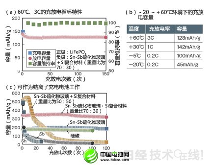 圖19:采用Sn-Sb硫化物玻璃類負(fù)極充放電1000次后仍維持了690mAh/g的放電容量 五鈴精工硝子開發(fā)出了經(jīng)過150次循環(huán)充放電后實(shí)現(xiàn)99%的容量維持率的鋰離子充電電池(a)。可在-20~+60℃的大溫度范圍內(nèi)使用(b)。特點(diǎn)是負(fù)極材料采用了Sn-Sb硫化物玻璃,還可用于鈉離子充電電池(c)。(圖由《日經(jīng)電子》根據(jù)五鈴精工硝子的資料制作) |