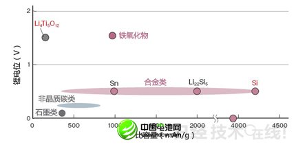 圖17:掌握高容量化關(guān)鍵的負(fù)極材料 負(fù)極材料有很多有望實(shí)現(xiàn)高容量化的材料候補(bǔ)。課題在于,因材料的膨脹和收縮難以獲得充分的循環(huán)壽命。在本屆電池研討會上,硅合金負(fù)極、錫合金負(fù)極和鐵氧化物等相關(guān)的發(fā)表受到關(guān)注。 |