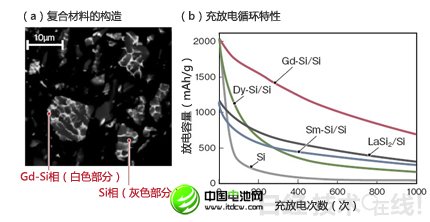 在稀土類金屬中,把采用釓(Gd)的復(fù)合材料Gd-Si/Si用作負(fù)極的電池,其容量和充放電循環(huán)特性尤其高。在基于杯形細(xì)胞(Beaker Cell)的試驗(yàn)中,初始充放電容量創(chuàng)下了1870mAh/g的極高值。充放電1000次后也維持了690mAh/g的容量。該研發(fā)小組已經(jīng)試制出以Gd-Si/Si為負(fù)極,以LiMn2O4為正極的電池。初始充放電容量為1230mAh/g,循環(huán)100次后為860mAh/g。
