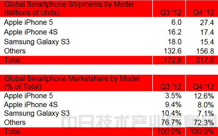 據Strategy Analytics介紹,2012年第四季度全球智能手機出貨量為2.17億部。其中iPhone 5占12.6%,iPhone 4S占8%。這兩款終端的出貨量均較上季度有所增加。“iPhone雖然是高價位終端,卻增加了銷量,表現出了出色的業績”。