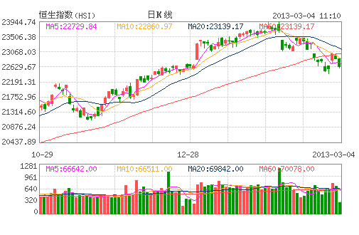 市場對或受惠國策新能源股有憧憬,風電股上周便率先炒高,另外有追捧的還包括環保、頁巖氣、光伏等國策股,今次兩會期內,相信“炒股不炒市”的情況會愈加明顯。有基金業人士表示,技術上而論,港股周四反彈至10天線(22,934點),同時是2月初以來引伸下降軌的阻力,可惜港股在周五未能再突破,如后市沒有力量突破23150點,后市應抱審慎態度。