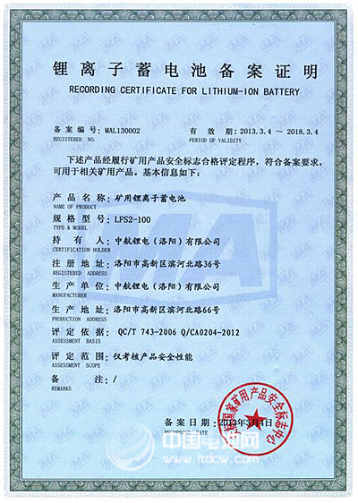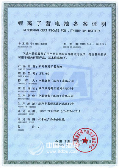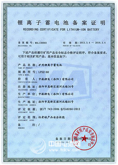 據(jù)中國(guó)電池網(wǎng)-中國(guó)電池雜志記者了解,鋰離子蓄電池因其優(yōu)異的安全性受到煤礦行業(yè)越來越多的關(guān)注,為進(jìn)一步提高礦用產(chǎn)品使用的鋰離子蓄電池的安全保障,安標(biāo)國(guó)家中心于2012年5月出臺(tái)了《礦用鋰離子蓄電池安全標(biāo)志管理方案》,要求礦用鋰離子蓄電池必須取得安全標(biāo)志備案證明才允許生產(chǎn)經(jīng)營(yíng)并在井下使用,為此,中航鋰電高度重視安標(biāo)備案工作。在經(jīng)過備案申請(qǐng)、受理、技術(shù)審查、現(xiàn)場(chǎng)評(píng)審、安全性能檢驗(yàn)等多個(gè)階段后,公司最終成功獲得備案證明。