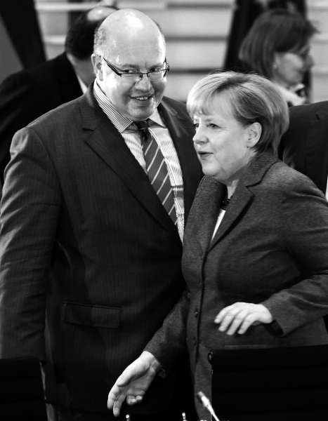 2012年11月2日,德國總理默克爾從剛抵達(dá)能源會議會場的環(huán)境、自然保護(hù)與核安全部部長Peter Altmaier身邊走過。此次會議的話題之一便是可再生能源供應(yīng)改革。