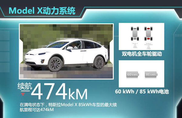 動力方面,特斯拉Model X將會推出配備60千瓦時或85千瓦時電池的兩種動力版本車型,最大功率分別為283kW和515kW。根據此前消息顯示,在滿電量狀態下,特斯拉Model X的60kWh車型最大續航里程為362公里,而85kWh車型的最大續航里程可達474公里,百公里加速時間僅需4秒。