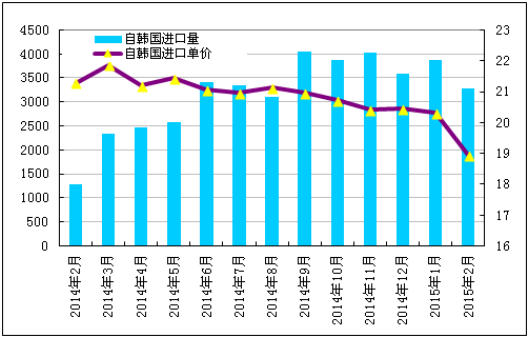 2015年2月份從韓國進(jìn)口多晶硅量減少至3286噸,環(huán)比減少15.0%;2月份進(jìn)口單價(jià)小幅下滑至18.95美元/千克,環(huán)比降幅為6.7%。