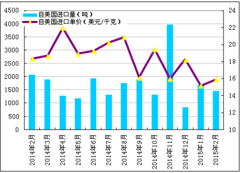 2015年2月份從美國進(jìn)口多晶硅量減少至1456噸,環(huán)比降幅為13.5%;2月份進(jìn)口單價(jià)微幅上調(diào)至15.90美元/千克,環(huán)比漲幅為5.0%。