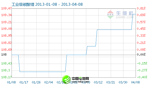 4月8日工業級碳酸鋰商品指數為109.37,與昨日持平,較周期內最高點112.10點(2012-11-04)下降了2.44%,較2012年01月05日最低點98.94點上漲了10.54%。